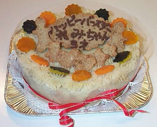また、フルーツをのせなくてもかわいくにぎやかにというご希望でしたので,にんじんとかぼちゃを柔らかく煮て,型で抜いています。お誕生日おめでとうのプレートやお人形のビスケットは卵なしで作りました。文字は,デコレーションと同じじゃがいも豆乳クリームにキャロブパウダーを加えて作りました。(素材はすべて,遺伝子組み換えのないもので,野菜は有機栽培のものを使用しています。)
